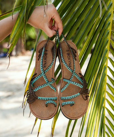 Turchese: il nostro bestseller! Sogna ad occhi aperti con onde marine e cieli luminosi. Con i tuoi sandali Bokyna sarai subito in vacanza e attirerai tutti gli sguardi sui tuoi outfit.